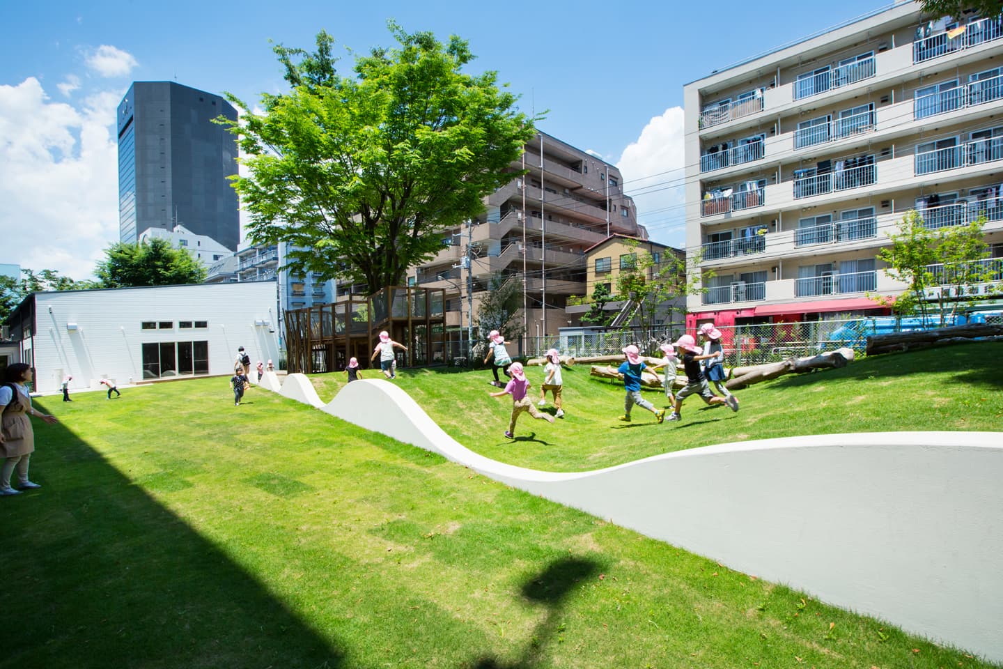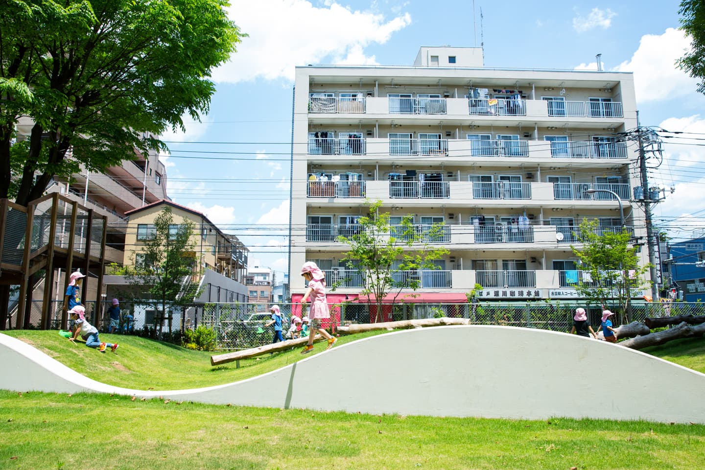 保育所の随所に果実のなる木を配置し、園庭には既存樹のケヤキを囲むようにツリーハウスを設置しています。子どもたちが植物と触れ合える環境づくりをめざしました。