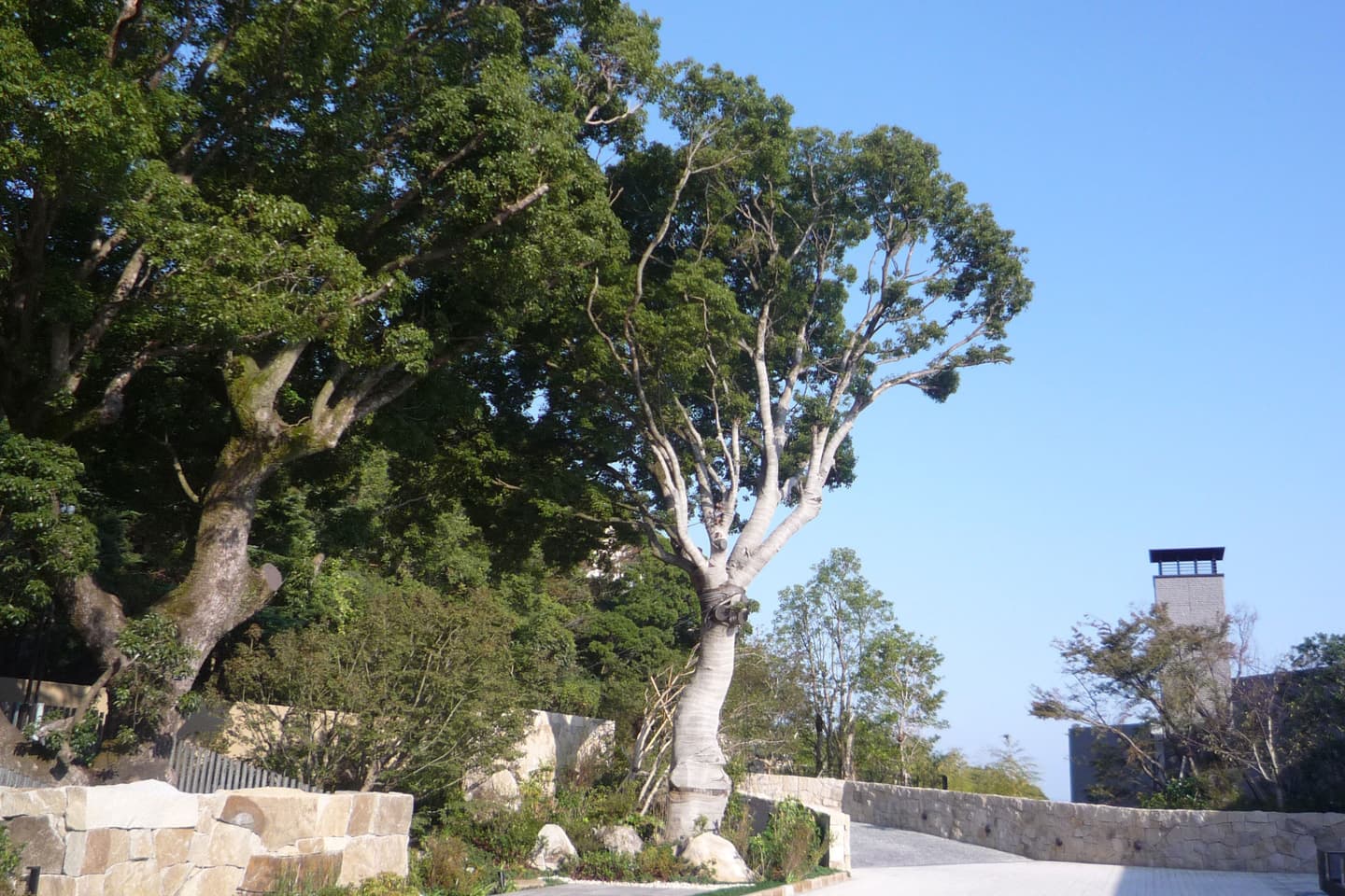 開放感のあるオーシャンビューのテラスが特徴です。エントランスにある巨大なクスノキを囲む石積みが高級感を演出します。