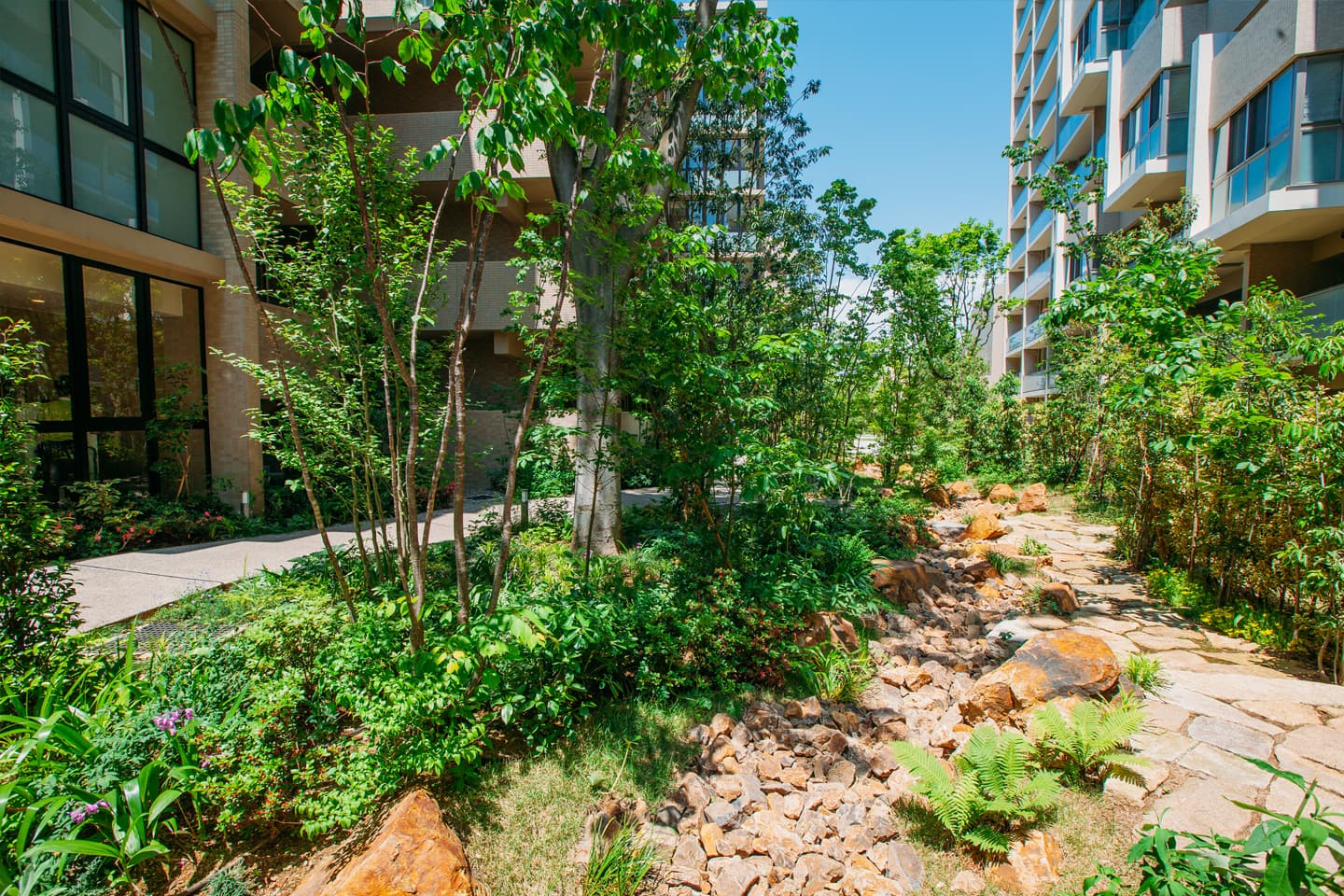 グランドメゾン狛江 2013年 東京都狛江市 積水ハウス株式会社 #Greentect #気候変動 #生物多様性 #マンション #造園建設 #関東 #2010年代 土地に根づく情景を再現したガーデン 既存の樹木と新たな植栽により立体感のある景観を創出しました。 TPM工法で移植した大径木のヒマラヤスギが迫力を与え、中庭の枯れ流れが昔にあった谷川を彷彿させています。